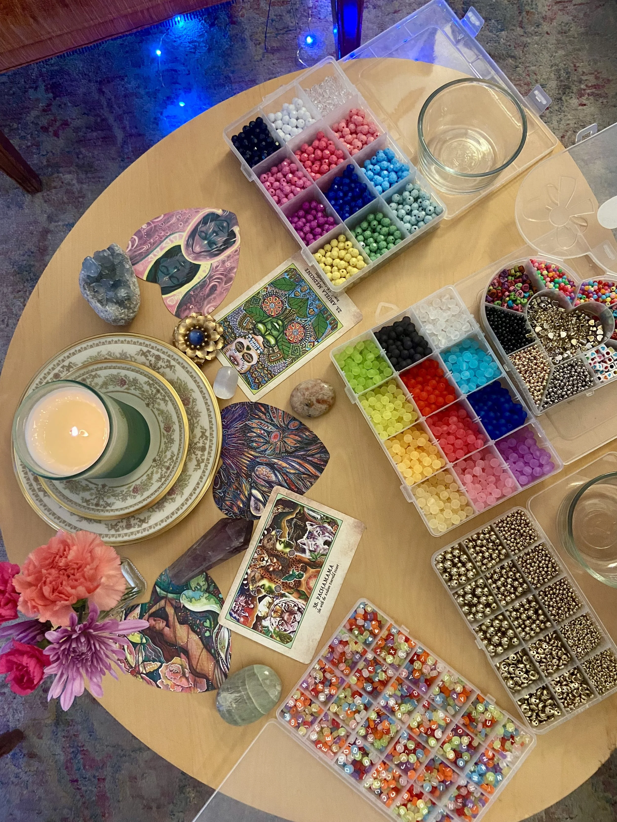 You get to decide what setting the vibe looks like for you. It might be lighting a candle and bringing in crystals and flowers. It could look like taking a walk together first, or spending some time outside noticing elements of nature before you bead. The point is to engage the senses and create a sense of presence.