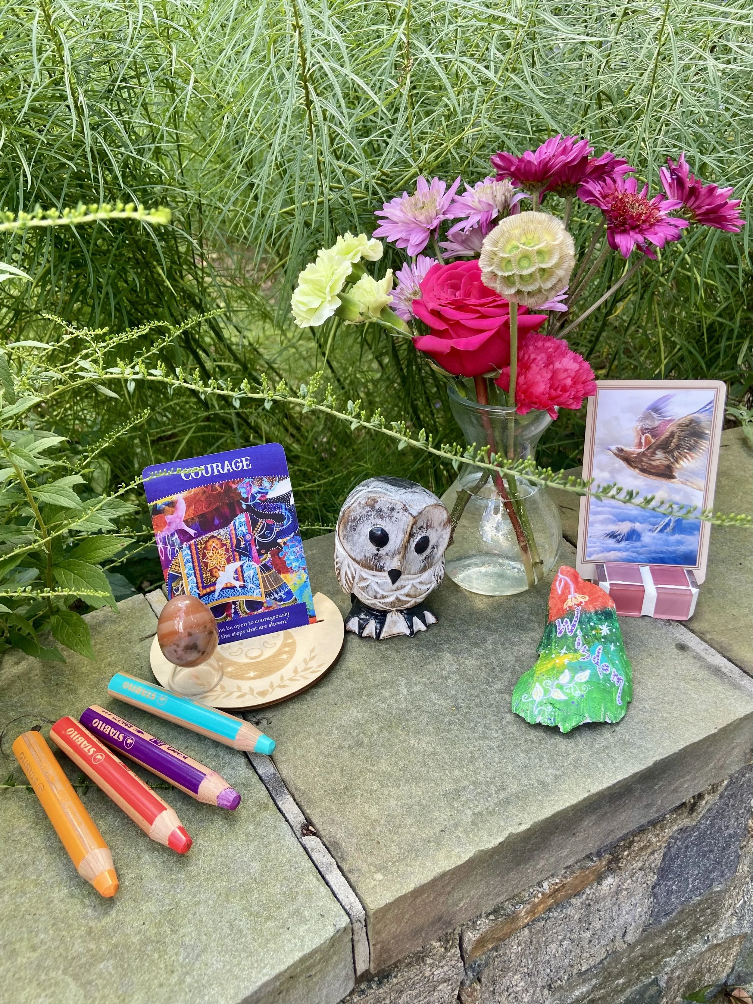 This week, I found myself drawn to four Stabilo chunky colored pencils - a new material I've only played with a few times. Including them felt like intention-setting, a way of inviting more play with this medium. I also gathered one of my favorite crystals, a carnelian egg, for potent creative expression, and a little wooden owl carving that's dear to my heart. Owls have always been a cherished spirit animal - I wish I could see them in the wild more often, but they remain mysterious and hidden. I added a shell I painted years ago with the intention of wisdom.